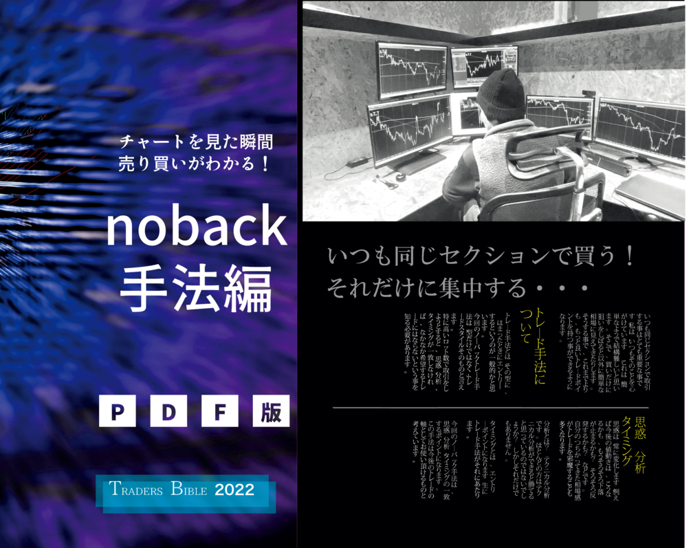 「noback手法」は、これまでのfx_nobackの集大成とも言えるトレード手法です。この「noback手法」を習得した受講者は、ほとんどの方が勝つ方法を身に着けています。チャートを見てなにをして良いのかわからない時や、テクニカル分析で優先順位がわからなくなった時や、マルチタイムフレームの問題、環境認識の問題を理解していなくても利益に繋げる事が出来るようになるのが「noback手法」です。